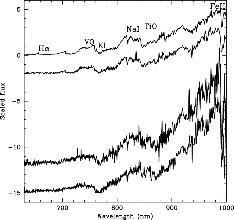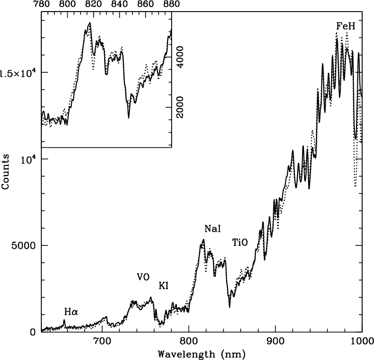 Spectroscopy of DENIS candidates presented herein was obtained in several observing runs using different telescopes. Following a chronological order, we started on March 2000 with ALFOSC on the Nordic Optical Telescope in La Palma. The grism number 5 provided a dispersion of 3.1 Å per pixel. Our second observing run was in September 2000 with the red arm of the ISIS spectrograph mounted on the 4.2-m William Herschel telescope in La Palma. The grating R158R provided a dispersion of 2.9 Å per pixel. The same telescope and instrumental configuration were again used on December 2006. However, a different CCD was installed, resulting in a dispersion of 1.6 Å per pixel. A slit of 1 arcsec gave a spectral resolution of 6.5 Å.