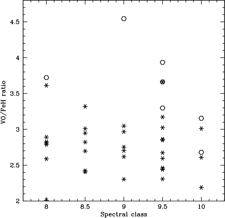 objects. Spectroscopic indices of TiO, VO, CrH, and FeH molecular