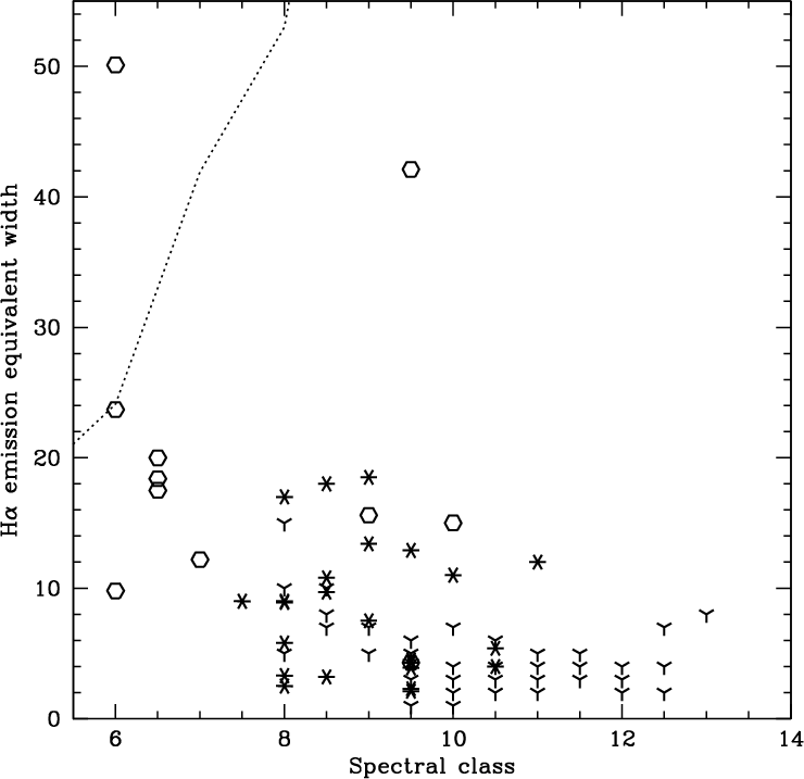 equivalent widths are measured in the spectra to identify young stellar