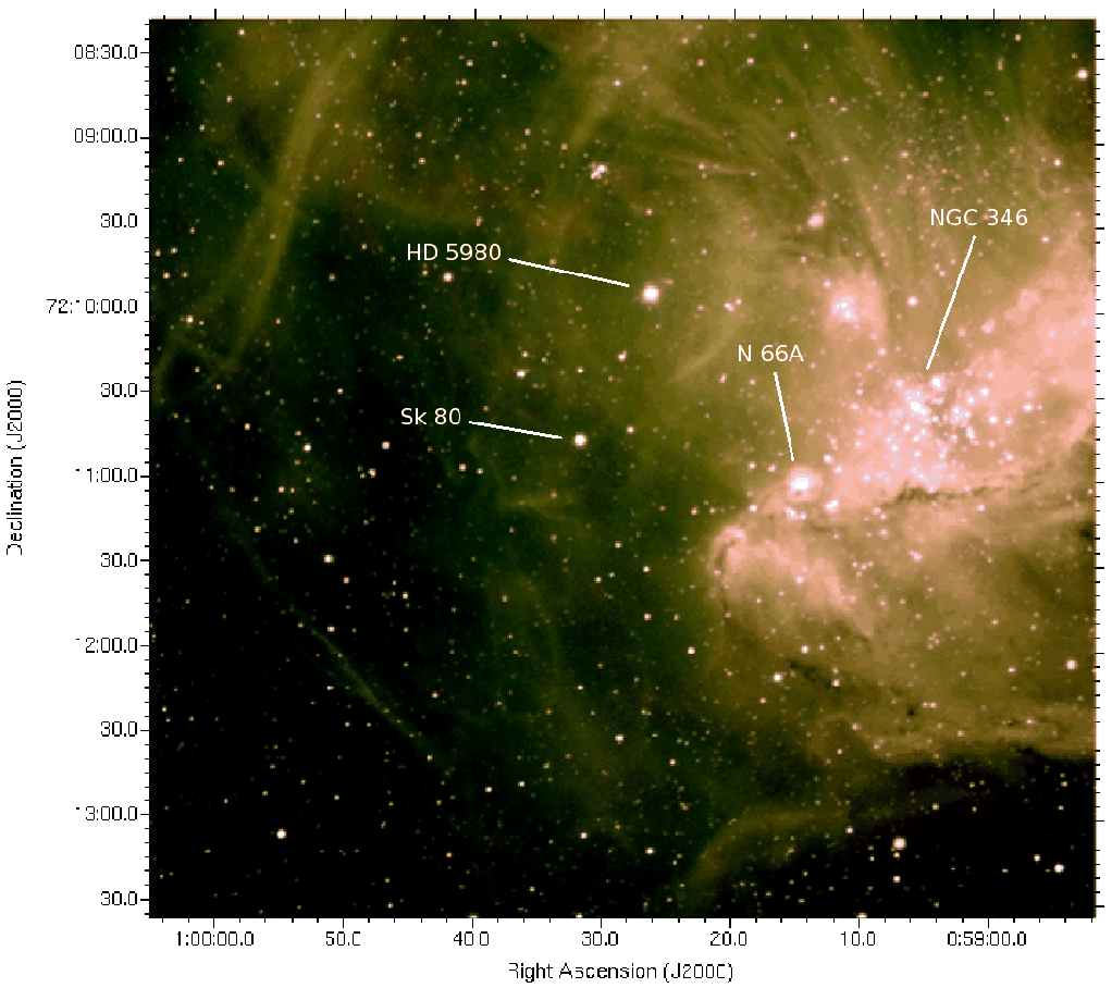 Our suggestion of a younger age for the exciting stars of N66A, however agrees perfectly with other studies of this region. In particular, Gouliermis et al. (2008) argue that the entire N66 region may host younger star formation events induced from the east, where the SNR B0057-724 lies (Nazé et al. 2002; Reid et al. 2006; Danforth et al. 2003; Nazé et al. 2004). There is indeed a large H I hole there, which is offset from the central parts of N66, and interesting enough, N66A lies on the triggered formation arc suggested to be associated with a shock wave coming from the direction of the SNR (their Fig. 1). An expanding H II region or a bubble blown by the winds of the massive progenitor of the SNR B0057-724 and possibly the W-R binary HD 5980 and the O7 Iaf+ star Sk 80 (Walborn & Fitzpatrick 1990) may be the stimulating agent. There are therefore stars of a range of ages in the N66 complex, HD 5980 and Sk 80 being older than the NGC 346 cluster, which has not yet produced any WN stars.