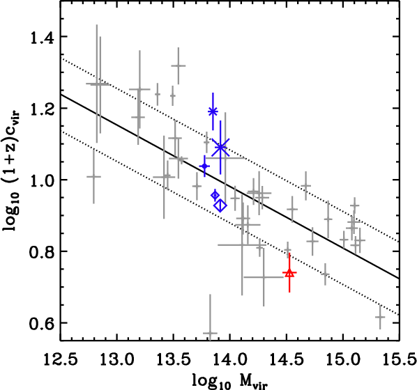 at which the logarithmic slope of the profile is -2, and a dimensionless concentration parameter, c (e.g., Navarro et al. 1997).