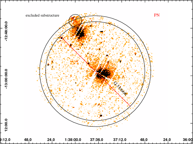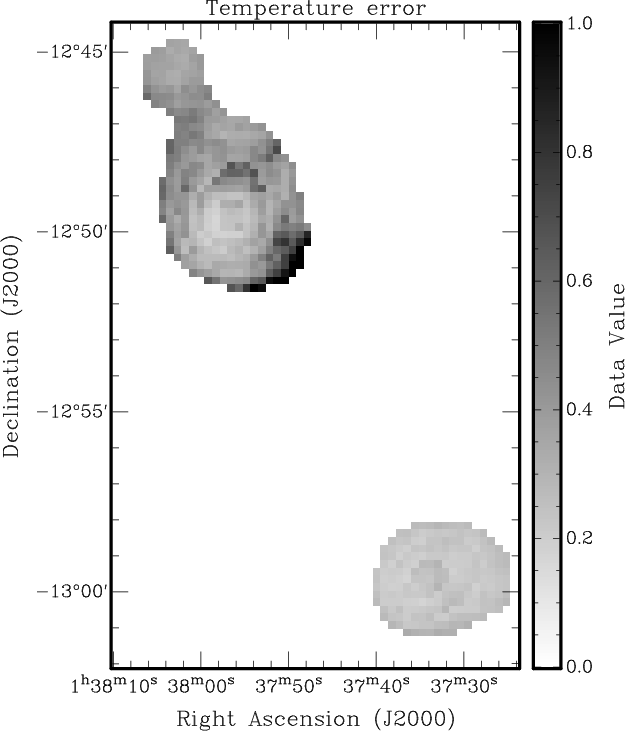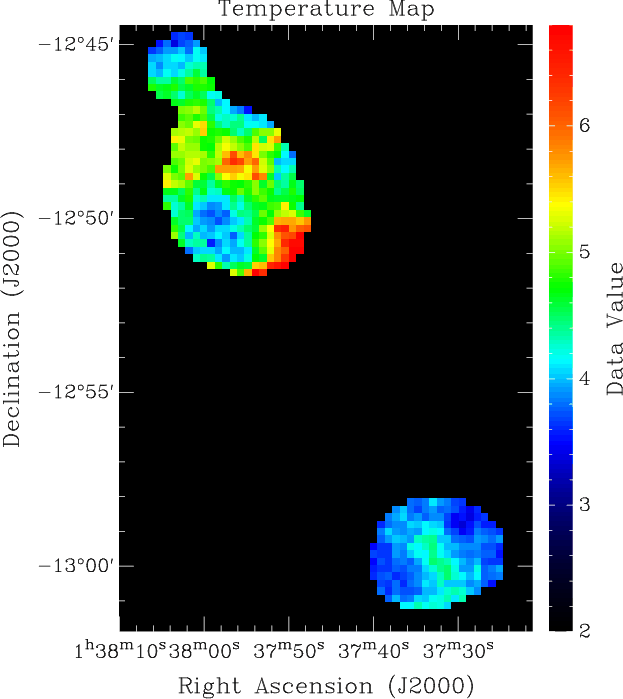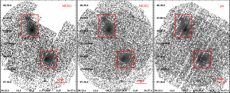 The existence of a 1.2 Mpc wide filament between both clusters was also found in X-rays by Werner et al. (2008).