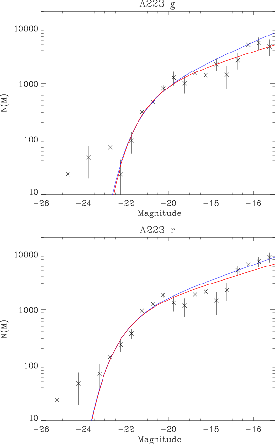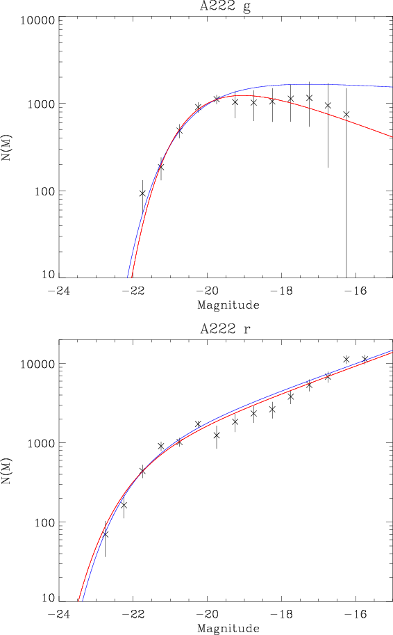Results. The GLFs of Abell 222 in the g' and r' bands are well fit by a Schechter function; the GLF is steeper in r' than in g'.