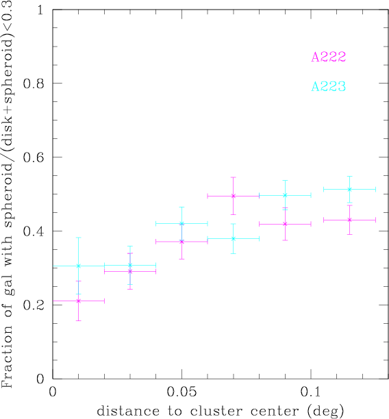 We present here a muti-wavelength optical and X-ray analysis of the clusters Abell 222 and Abell 223. The optical part is based on imaging in the g' and r' bands obtained with the CFHT Megaprime/Megacam camera and retrieved from the Megapipe image stacking pipeline at CADC (Gwyn 2009). As seen in Table 1, the r' band data are about 0.55 mag deeper than the g' band data (by taking an average color g'-r'=0.85), and will be given priority in the morphological analysis; the g' data will be used to select bright cluster members from color-magnitude diagrams, and also because the g' band is more sensitive to star formation than the r' band. These images are deeper than those of Dietrich by at least 0.5 mag (our raw galaxy counts start decreasing for r'>24.5 while Dietrich et al. say that their counts in the R band stop following a power law for R>24), and therefore allow to probe the GLF to somewhat fainter magnitudes. Our X-ray analysis is based on archive XMM-Newton data.