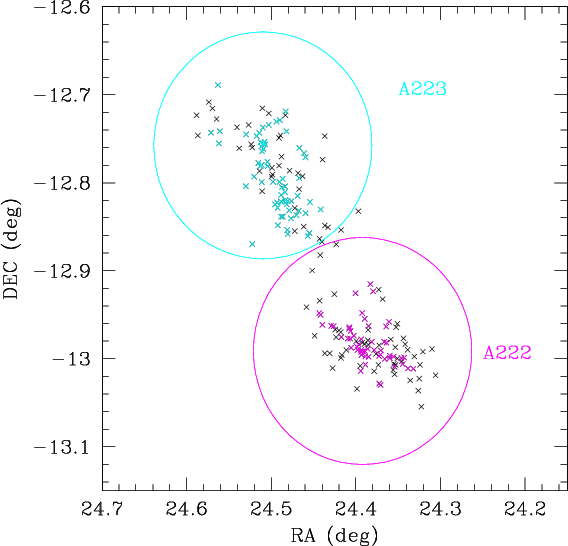 and velocity dispersions of 1014 and 1032 km s-1, for Abell 222 and Abell 223 respectively. As