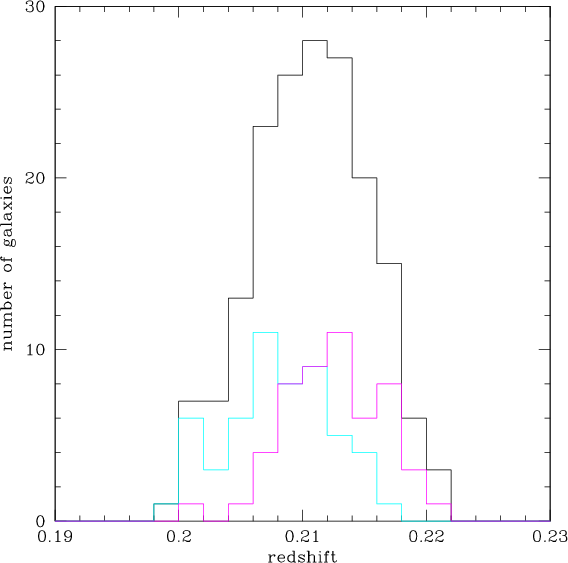 luminosities. Abell 222 appears relatively relaxed, with a galaxy