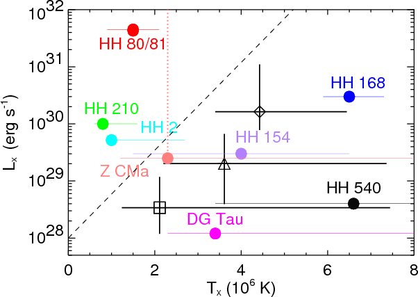 The X-ray sources detected in HH jets are characterized by different morphologies, luminosities, and locations within the jet. In some cases, the X-ray-emitting region is located at the base of the (optical) jet, near the protostar from which the jet originates. This is the case, for instance, for the low-mass (LM) HH 154 and DG Tau jets, both in Taurus (see Güdel et al. 2005; Bally et al. 2003). In other cases, the X-ray source is located farther away from the protostar as, for example, for the high-mass (HM) HH 80/81 jet. Concerning the morphology, some of the X-ray sources cannot be resolved by current instruments (and appear point-like), some others appear to be elongated. In one case (HH 154) a knotty X-ray source is found (resembling the knotty morphology commonly observed in the optical emission from HH jets), which consists of an elongated tail with a measurable proper motion away from the stellar source and an apparently stationary point-like source (Favata et al. 2006).
