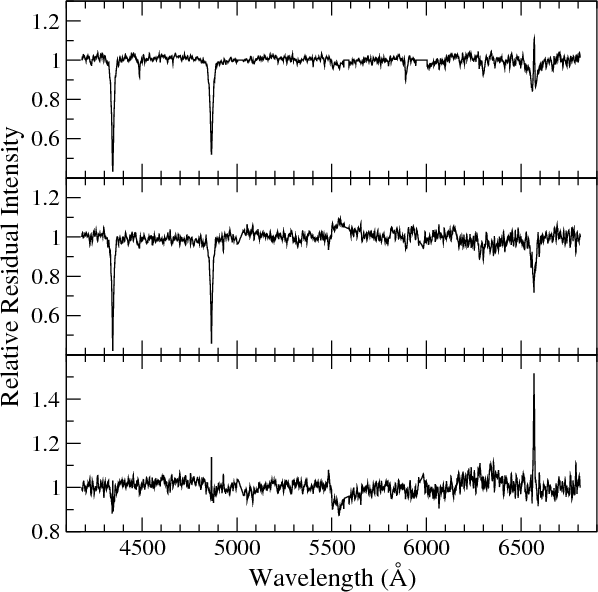 Figure 4: Spectra of stars 1a (top), 1b (center), and the ratio of the spectra 1a to 1b (bottom). The glitch at 5500 Å is instrumental; two CCD gaps can be seen at 5000 Å and 6000 Å. |