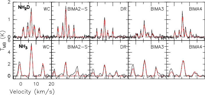 close to these cores (see Fig. 1 and Beuther et al. 2004a). This interpretation is reinforced by the line broadening of NH2D observed towards BIMA 3 and BIMA 4 (see Fig. 2). In conclusion, while