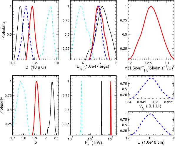 Figure 2: Probability density function of model parameters normalized at the peak value. Different line types correspond to different models as explained in Fig. 1 and the text. |