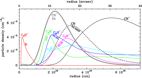 Figure 2: Abundance distribution derived for CN- in the envelope of IRC +10216 (thick grey line labeled as ``CN- fit''), as it reproduces the CN- observed line profiles (see Fig. 3). Also shown are the abundances of CN-, CN, and other molecular anions calculated with the chemical model (multiplied by 0.0003, 5, 15, 0.03, and 0.05 for CN, C2H-, C4H-, C6H-, and C5N-, respectively). The abundances are expressed as number of molecules per cubic centimeter. The angular distance is given in the top axis for an assumed distance to IRC +10216 of 120 pc. |