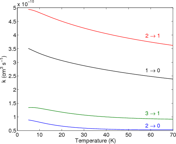 where k is the Boltzmann constant. To obtain precise values of the rate constants, the energy grid was chosen to be sufficiently fine to include the numerous scattering resonances. The total energy range considered in this work allows us to determine rate coefficients up to 70 K. The temperature dependence of the rate coefficients for selected de-excitation transitions is illustrated in Fig. A.1, with the values given in Table A.1.