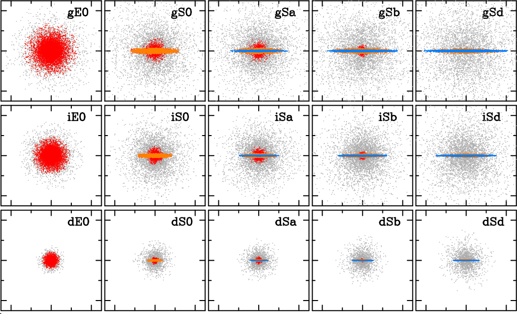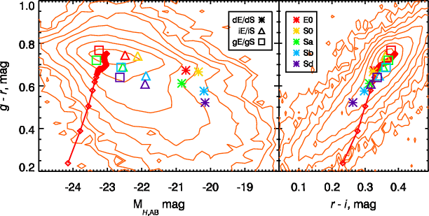 Figure 9: Colour-magnitude (left) and colour-colour relations demonstrating contour density plots for 80 000 observed low-redshift (z < 0.3) SDSS galaxies, GalMer galaxy models corresponding to isolated galaxies of different masses and morphological types, and a sequence of a GalMer simulation of a giant-giant interaction followed from the merger epoch for 1.5 Gyr every 50 Myr (red diamonds). Colours (see right panel legend) code morphological type, while symbol shapes (asterisk, triangle and square, see left panel legend) code luminosity-class. |