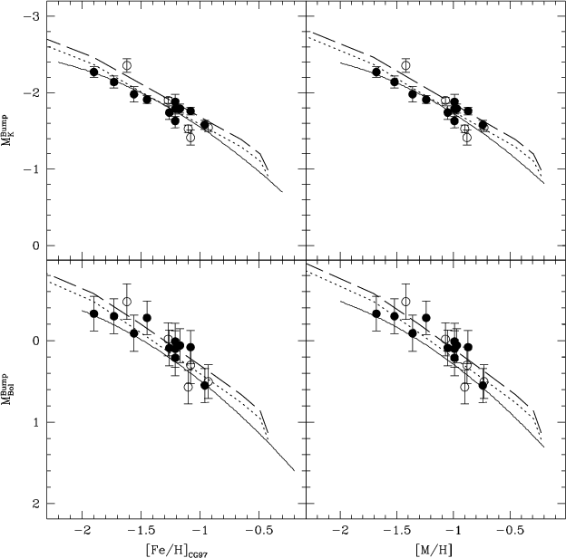 magnitudes of the RGB bump and tip for the metal-poor clusters in the