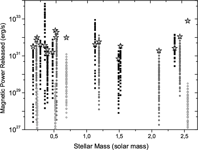 - We note that Favata et al. (2005), assuming equipartition between gas and magnetic field, have estimated minimum magnetic field values for the loops of the COUP sources that vary between a few dozens to a few kG. On the other hand, the magnetic fields that are typically measured at the surface of (class II) YSOs, i.e., T Tauri stars, are between 1 and 3 kG (e.g., Valenti & Johns-Krull 2004, and references therein; Symington et al. 2005). It is possible that such strong stellar fields are mainly associated with local multipolar components (e.g., starspots) and actually some of these recent polarimetric measurements (Valenti & Johns-Krull 2004) indicate a weaker dipolar component (lower than 200 G). Nonetheless, because, we are concerned with the inner disk-star interacting zone near which the amplitude of the stellar magnetic field must be maximized by the presence of small scale multipoles and compressed field lines, we adopt stellar field magnitudes in the kG range.