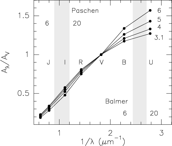 The comparison of (narrow-band) spectro-photometric measurements of a star of known spectral type with its non-reddened energy distribution allows AV, R to be determined. The spectral bands can be the colours LKHJIRVBU, as used by Cardelli et al. (1989) for deriving the reddening law.