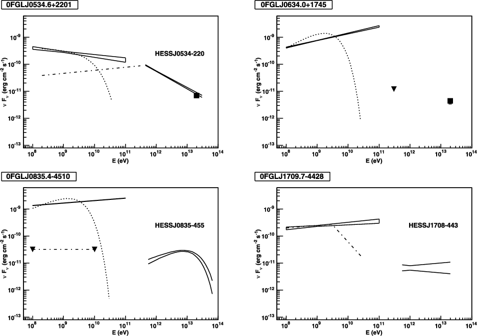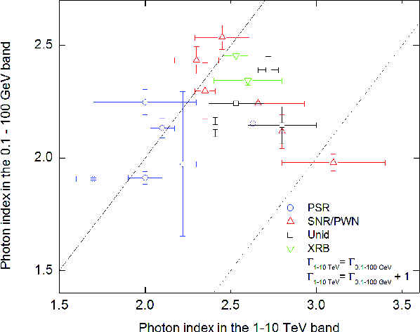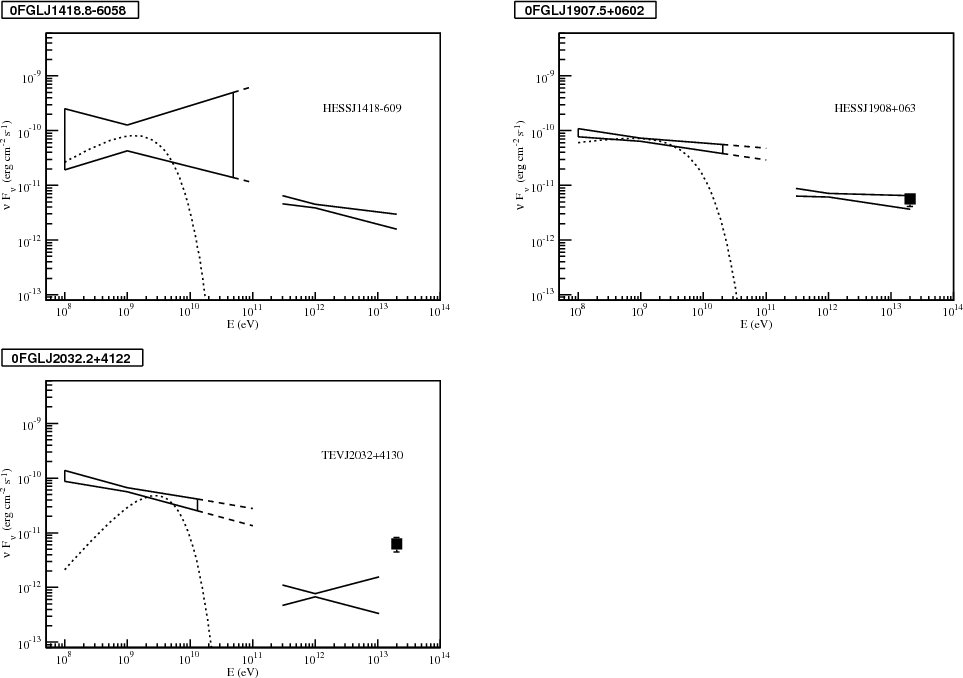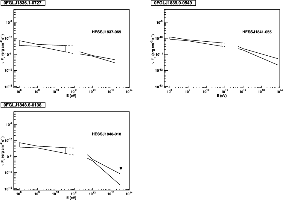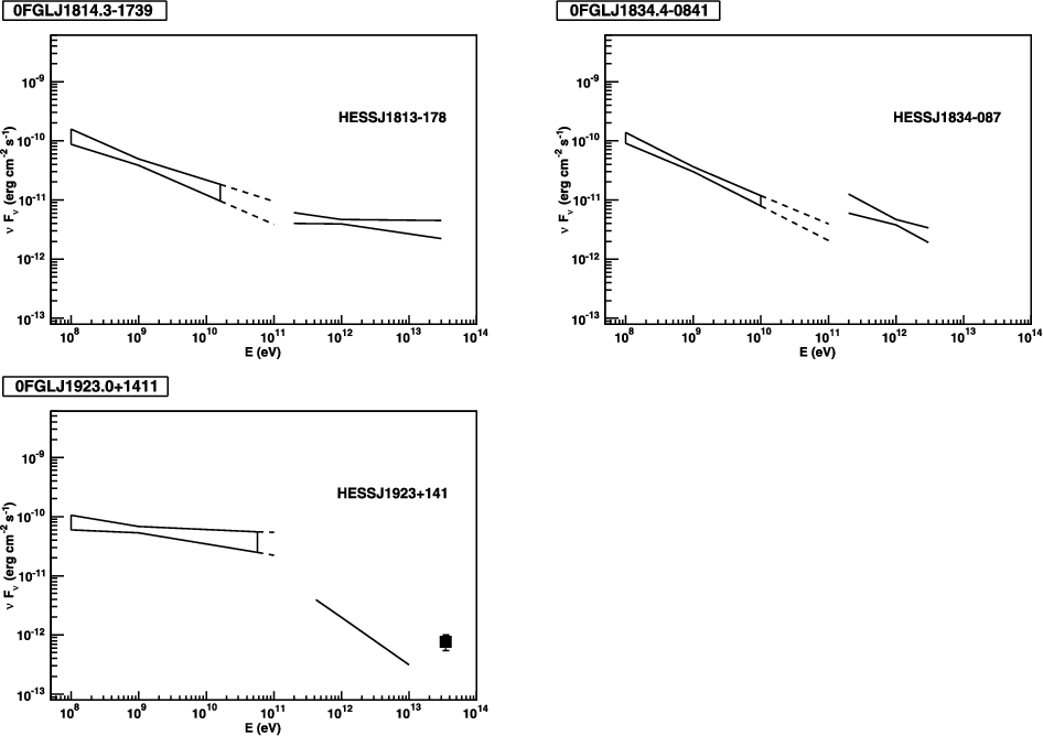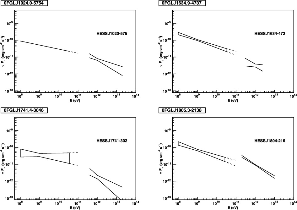 12: Photon index in the 0.1-100 GeV band (derived according to Sect. 3.1) versus photon index in the 1-10 TeV band, for coincident GeV/TeV sources. 0FGL J1923.0+1411/HESS J1923+141 is not included since its VHE photon index is not known. |