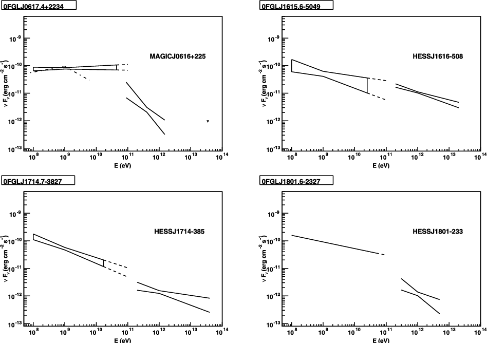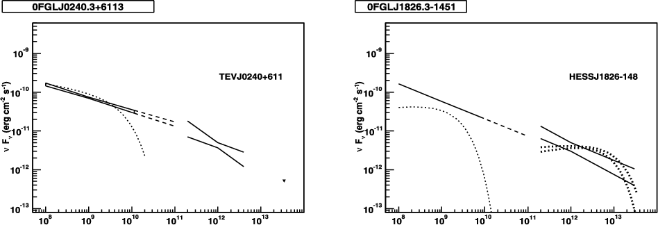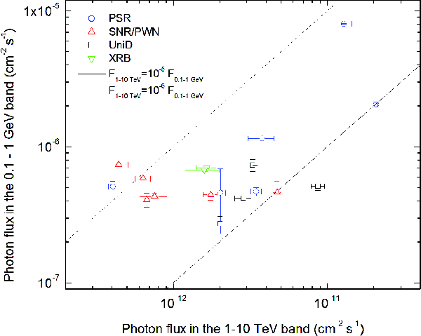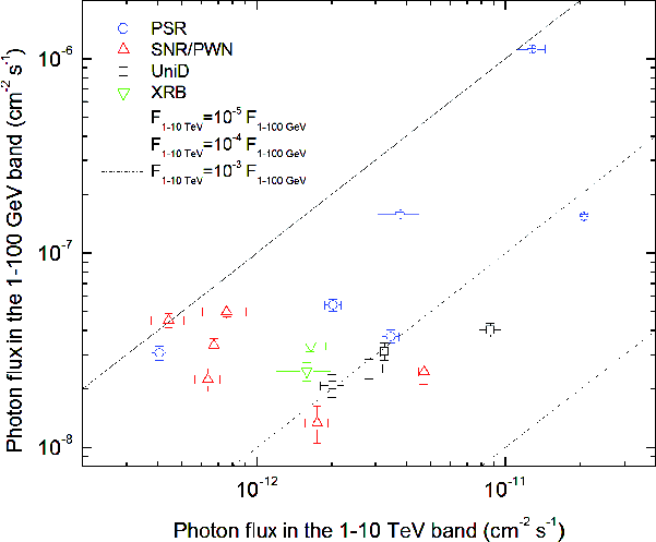 10: Photon flux in the 100 MeV-1 GeV band versus flux in the 1-10 TeV band for coincident GeV/TeV sources. |