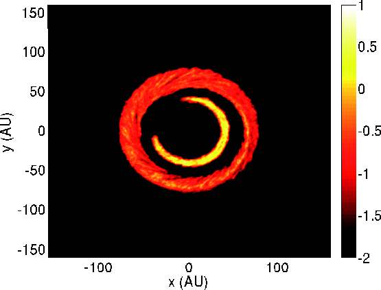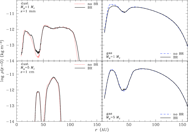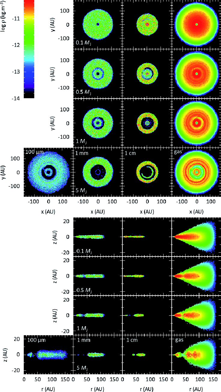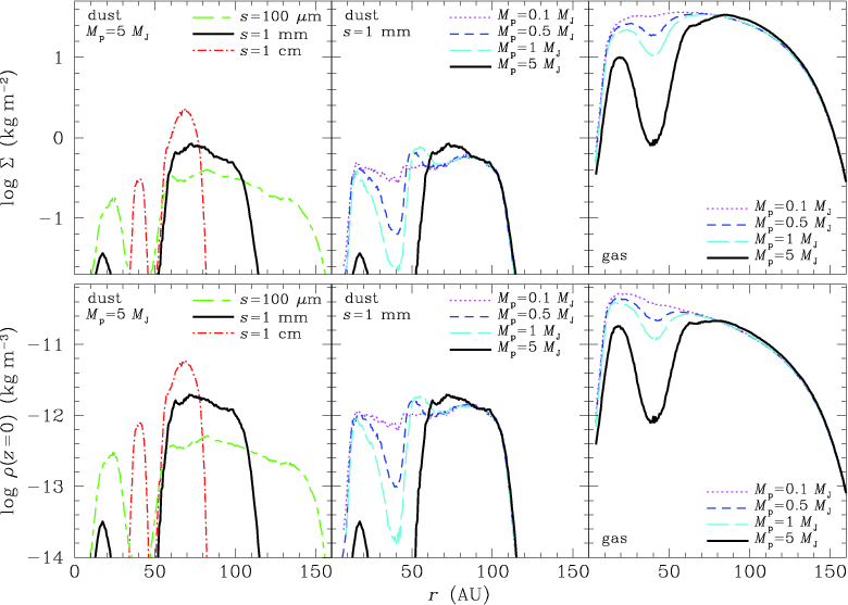 We have also investigated the formation of a gap by a planet immersed in a Minimum Mass Solar Nebula (MMSN) and showed that dust settling makes the gap much more striking in the dust layer than in the gas phase because of its reduced vertical extension for weakly coupled grains (Fouchet et al. 2007; Maddison et al. 2007, hereafter F07)Fouchet07F07. Indeed, the criterion for gap formation depends on the disk scale height (Crida et al. 2006). Because of the size of particles in the weakly coupled regime for the particular case of the MMSN (1 m, see Sect. 2), that study had no direct application to observations. Images of dusty disks at infrared wavelengths do not probe such large particles, but instead trace the smaller, strongly coupled dust grains whose distribution is similar to that of the gas.