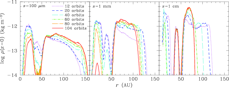 note that cm-sized grains remain inside the gap in corotation and that