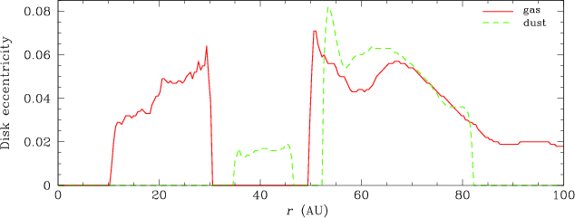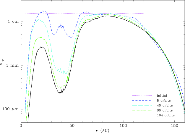 From those considerations, in a disk with an embedded planet we therefore expect dust grains to migrate towards the pressure maxima on either side of the gap and to accumulate there. This behaviour has been observed by, e.g., Paardekooper & Mellema (2004,2006a), Maddison et al. (2007), and Fouchet07.