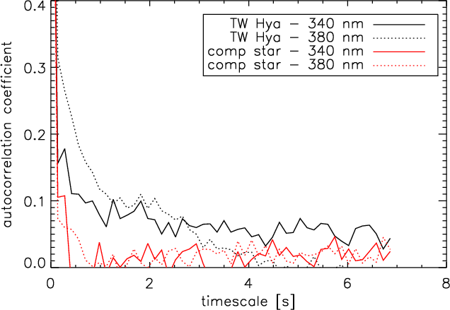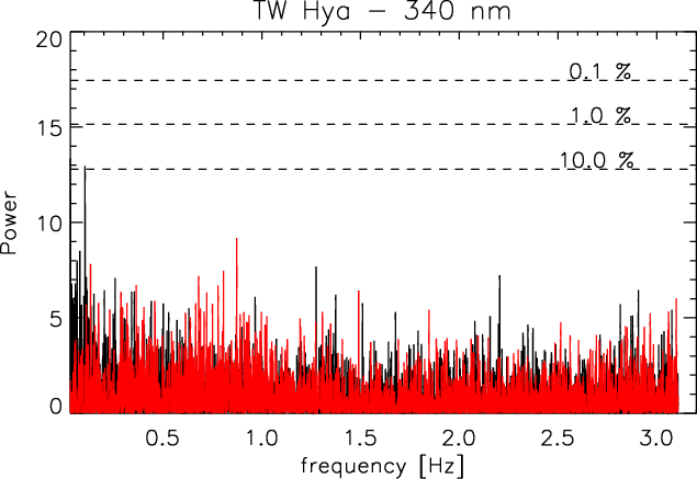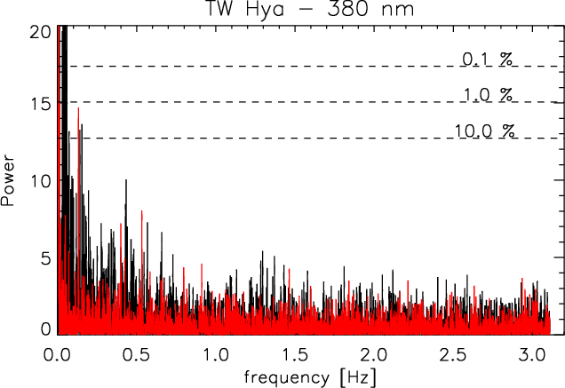 The most direct tracer of the accretion shock is the soft X-ray emission. This is formed just behind the shock front, where the accreted material is heated to a 2-3 MK (Lamzin 1998; Günther et al. 2007). Drake et al. (2009) used XMM-Newton X-ray data to search for periodicity in TW Hya, one of the best-studied CTTS. They did not detect any period and set an upper limit on the pulsed fraction of 5% at the 99% confidence level over the interval 0.001-7 Hz. TW Hya is the only target where the X-ray count rate is high enough to perform timing analyses on scales below a minute. In this paper we use a secondary tracer of the accretion shock. We obtained observations in the blue band, using optical telescopes. In the blue and the UV range, CTTS are dominated by the continuum emission from the accretion shock (Lynden-Bell & Pringle 1974; Muzerolle et al. 2000; Grinin 1980) because they are late-type objects and their photospheric emission quickly drops towards shorter wavelengths. It is not clear from the current models how fast the optical emission reacts to shock instabilities, but observations in the visible potentially provide a diagnostic with high signal-to-noise ratio, and yield a complementary view on sub-minute variability.