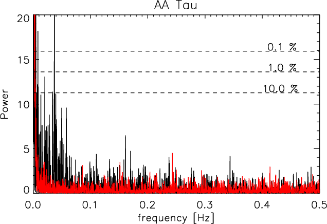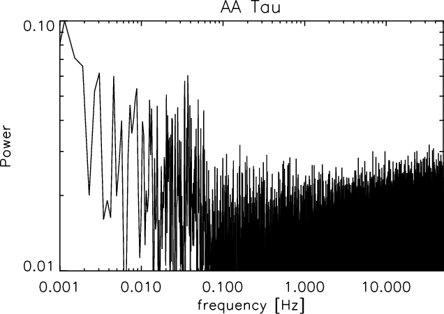 In contrast to TW Hya, AA Tau is observed nearly edge-on (O'Sullivan et al. 2005) and periodically a warp in the disk occults the star, causing brightness variations of 1.4 mag (Vrba et al. 1989; Bouvier et al. 1999; Vrba et al. 1993; Herbig 1977; Ménard et al. 2003). The period is 8.22 days, which seems to be the stellar rotation period (Bouvier et al. 2007).