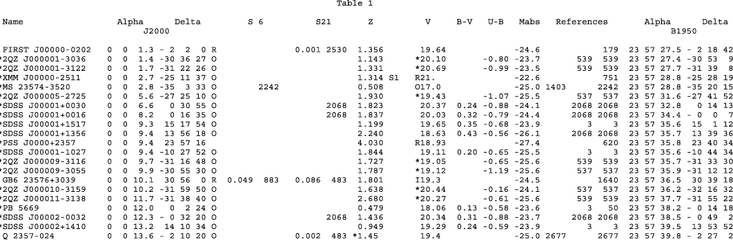 1) Columns 1 and 2 give the most common name of the object. For the meaning and the sources of the designations see Hewitt & Burbidge (1987), Fernandez et al. (1983), and Kesteven & Bridle (1977). For the sources discovered by the ROSAT X-ray satellite, we used the following acronyms: RXS for the sources appearing in the All-Sky Bright Source Catalogue (Voges et al. 1999), 1WGA for the sources published in the WGACAT catalogue (White et al. 1994), and RX for the others. When the name is preceded by an *, the object has not been explicitly associated with a radio source.2) Columns 3 to 10 give the best available J2000 optical or radio coordinates. The J2000 positions have been converted from the B1950 positions using the matrix given by Aoki et al. (1983). An O or an R following the coordinates means that the position is either an optical or a radio position measured with an accuracy better than one arcsec. An A means that it is only an approximate position that may be wrong by several arc minutes. No reference is given for the source of the positions.