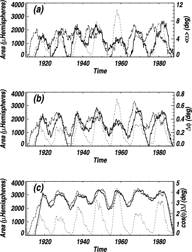 This result indicates that calculating the cycle-to-cycle deviations from a reference Joy's law is identical to calculating Joy's law for each cycle and then subtracting a fixed constant. A similar result can be shown if