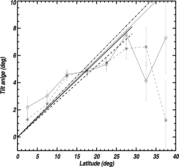 analyse the latitudinal distribution of the tilt angles (Joy's law),