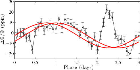Figure 2: Folded time series over 3.023573 days. The 2 red sine curves represent the minimum and maximum limits of the expected signal according to the ephemeris of Butler et al. (2006). |