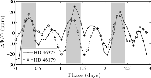 Figure 3: Folding of the HD 46375 and HD 46179 time series over 3 days. The grey zones correspond to region where the correlation between both light curves is maximum. |