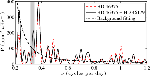 Figure 5: Power density spectra of the time series corresponding to the difference between HD 46375 and HD 46179 lightcurves, compared to HD 46375. |