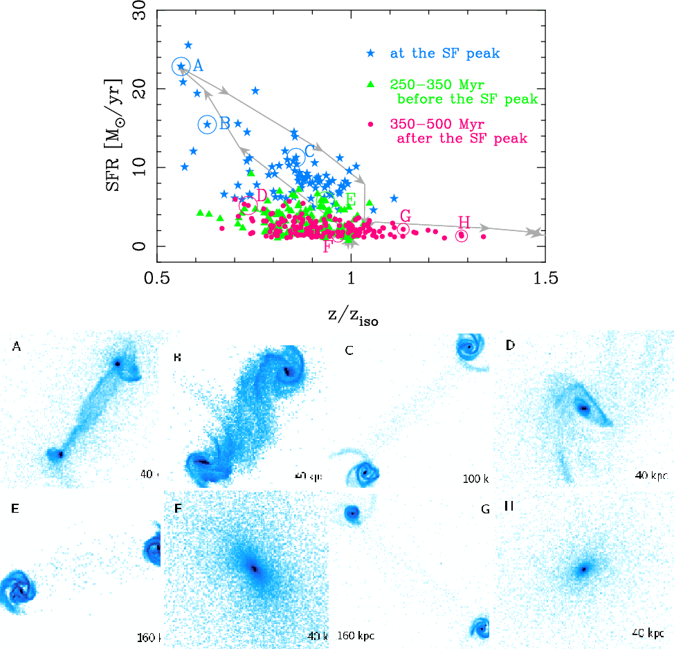 simulations), and the most intense star formation and lowest gas phase