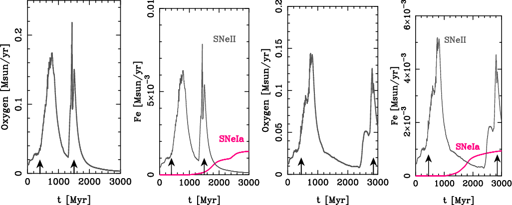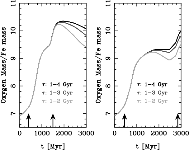 - Any possible time delay would result into a time-shift between the SFR peak and the oxygen and SNeII-Fe peak.
