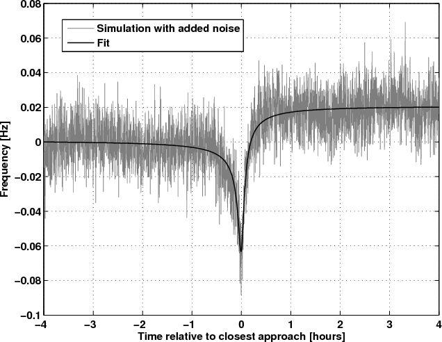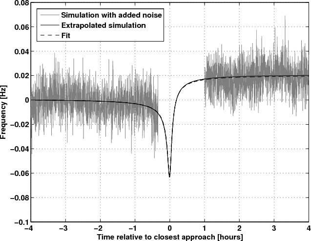 Figure 4: Simulated flyby scenario with tracking stop 20 min before closest approach and resumption of tracking one hour after closest approach. |