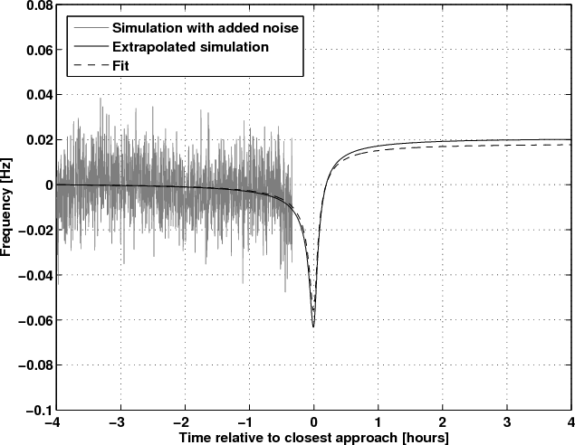 Figure 3: Simulated flyby scenario with tracking stop 20 min before closest approach and no post-encounter tracking. The difference between the simulation (solid curve) and the fit to the data (dashed line) after the flyby is obvious. |