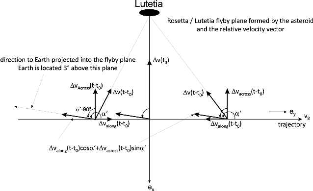 In practice, the spacecraft orbital elements after the last manoeuvre before closest approach will be computed from the radio tracking directly after this manoeuvre. The post-manoeuvre trajectory will be extrapolated by solving the equation of motion for Rosetta to many hours after closest approach, assuming that the asteroid and its perturbing forces are not present. This extrapolated unperturbed trajectory, the gravity attraction of all planets acting on Rosetta, the knowledge of the precise location of the ground station on the surface, the Earth rotation, plate tectonics, solid Earth tides, the position of the antenna phase centres on ground, and relativistic propagation effects, all provide the basis for the computation of the relative velocity vector along the line-of-sight (LOS). This leads to a predicted Doppler shift and, together with the transmitted carrier frequency, to a predicted received frequency for all times during and after the flyby.