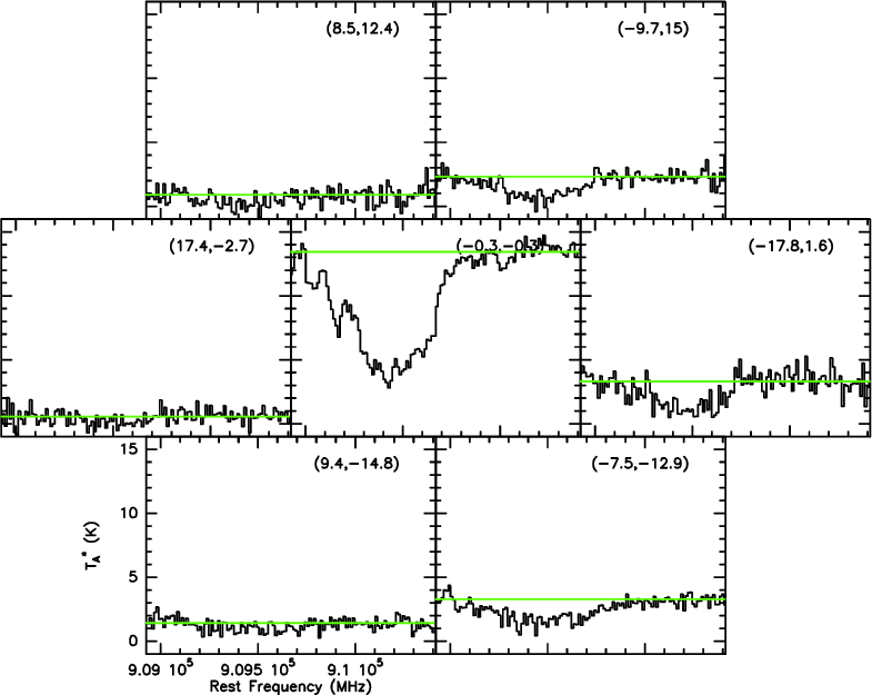 Figure 1: OH+ spectrum towards Sgr B2(M) observed with the 7 pixels of the CHAMP+ high frequency array. The continuum level for each spectrum is indicated by a straight, green line and the offsets (RA/Dec) from Sgr B2(M) of the individual pixels are given in each box in second of arc. |