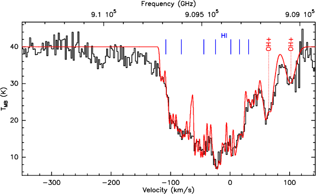 Optical depths of individual velocity components of OH+ go up to 1.5 meaning that for the other THz lines of OH+ at 972 and 1033 GHz, which are about a factor 4 and 2, respectively, stronger, optical depths will become a problem in the analysis of the column densities. Also the increasing number of hyperfine components will become an issue in the interpretation of absorption of large velocity ranges. For extreme clouds, it might even be feasible to observe the less abundant 18OH+ isotopologue.
