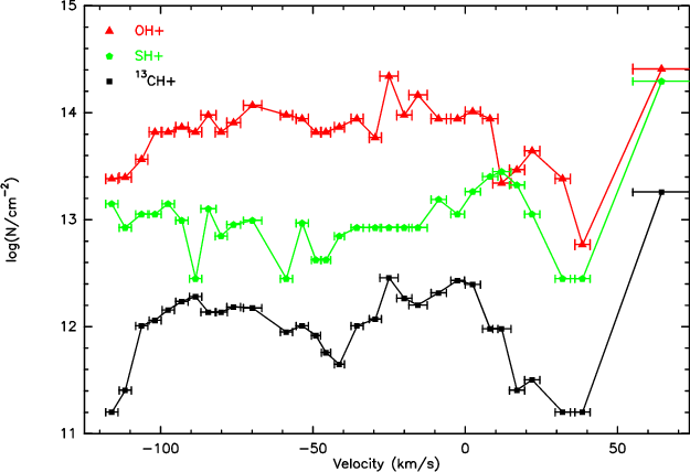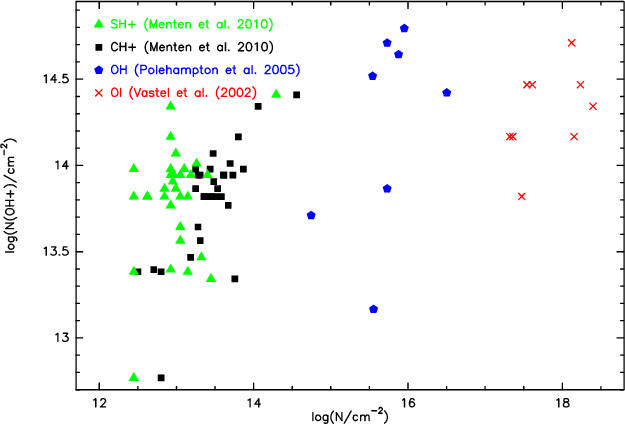 Table 3: Median column density ratios and ratio ranges of different molecules with respect to OH+ (Polehampton et al. 2005; Vastel et al. 2002; Menten et al. 2010).