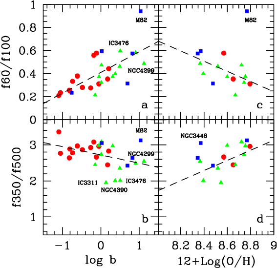 The relationship between the infrared colours f60/f100 and f350/f500 and the birthrate parameter b ( a), b)) and the metallicity ( c), d)). Symbols are coded as in Fig. 1. The dashed lines give the linear best fits to the data: f60/f100 = 0.18 |