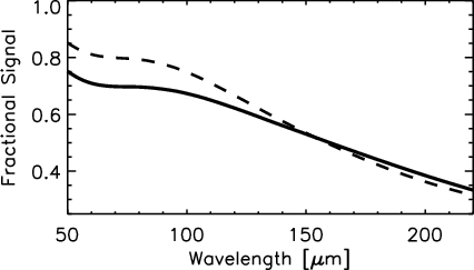Figure 9: Point source correction: the fraction of signal seen by the central PACS spectrometer spaxel. Dashed line: theoretical calculation from idealised PSF; solid line: 3rd order polynomial fit to results from rasters on Neptune. |