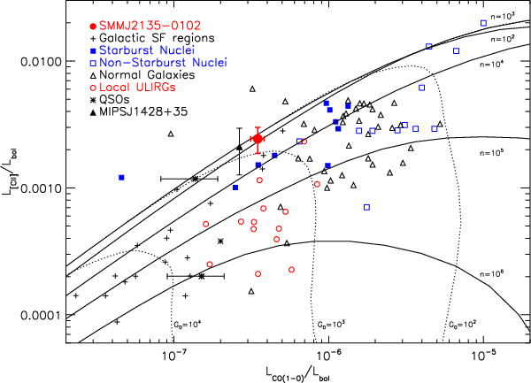 more intense than that in the Milky Way, but comparable to that found in local ULIRGs and the z=1.3 SMG, MIPS J1428 (Hailey-Dunsheath et al. 2010), while the densities in SMM J2135 (