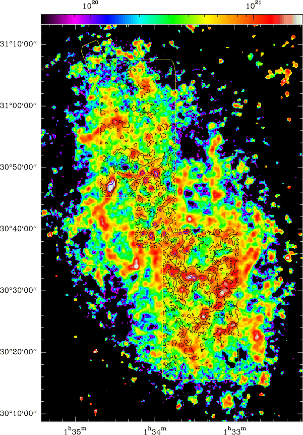 In the outer disk, however, the H I column density (where no CO emission is present) is roughly equal to what is derived from the dust with
