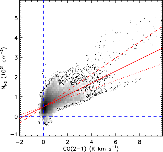 morphological comparison of the dust-derived H2 column and the CO contours in Fig. 4 shows that while major regions were not missed by the CO observations, the dust-derived H2 map does not correlate perfectly with the CO.
