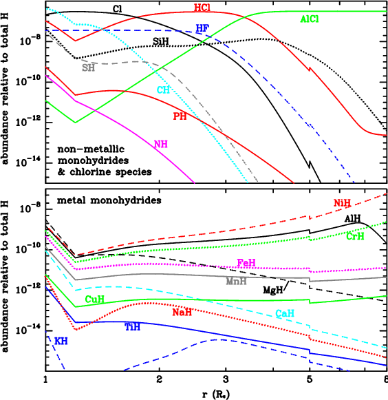 Figure 2: Abundances of several hydrides computed by thermochemical equilibrium for the stellar atmosphere and inner envelope of IRC +10216. Abundances are relative to total H and are shown as a function of the distance to the center of the star. |