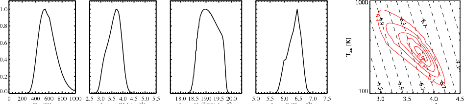 Figure 3: Left panel: likelihood distributions of kinetic temperature, density, CO column density and pressure. Right panel: likelihood contour plot of temperature and density. Dashed lines show constant pressure (Log10 P (K cm-3)) relations. |
