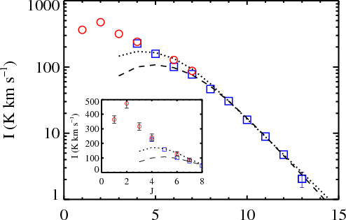 The strengths of the CO lines place fundamental constraints on the physical properties of the molecular gas. Tilanus et al. (1991) fitted 12CO and 13CO lines from the central starburst up to J = 3-2