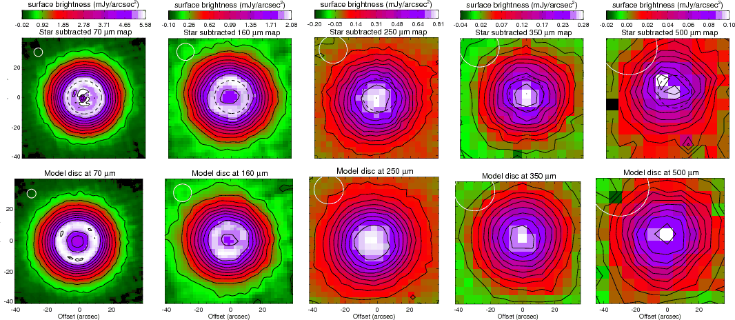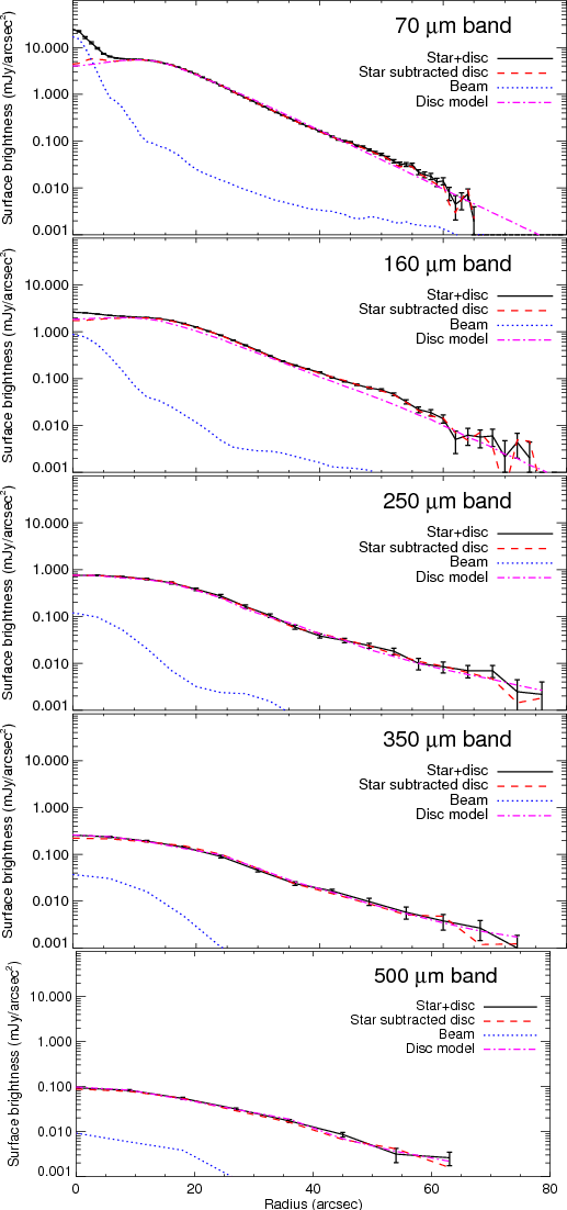 - The peak surface brightness of the dust disc was identified at 70 and 160